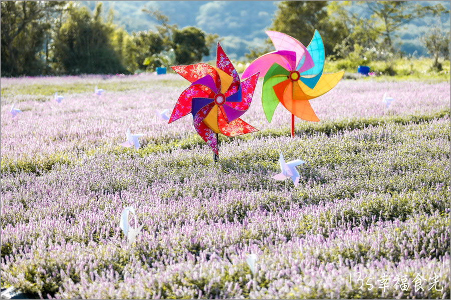 ▼大型花布風車充滿濃厚的客家文化風味,與紫色仙草花海搭配,特別有亮點!