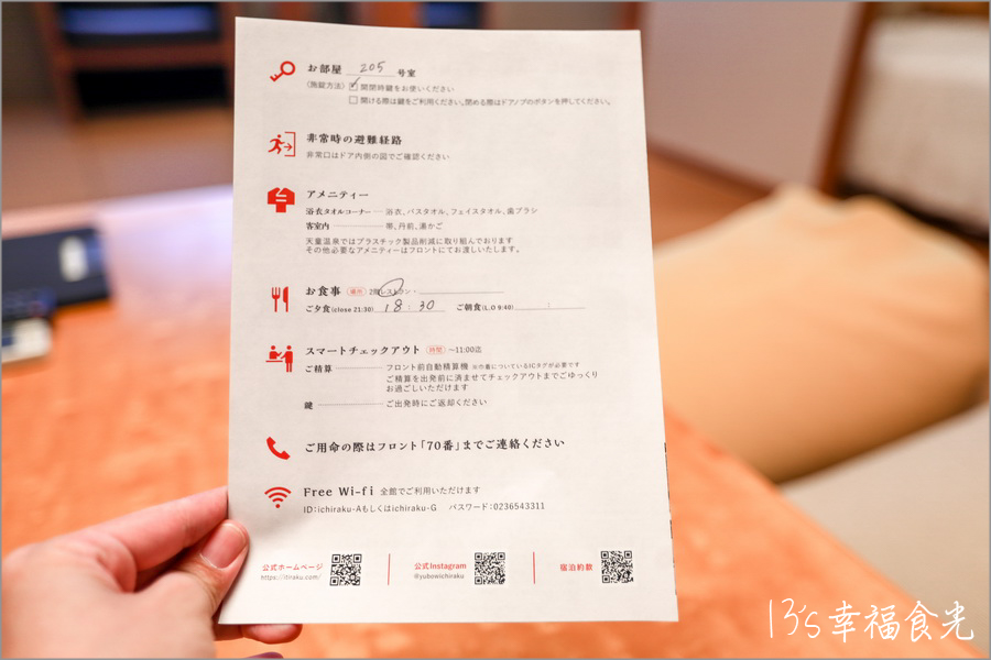▼入住時也會拿到一張飯店簡介說明單,上面有非常詳細的說明,如︰wifi帳密、總機連絡、晚餐時間及旅館內各項設施開放及營業時間等等。