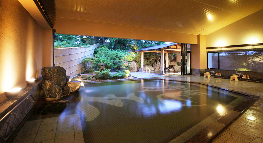 室內大浴場的設計有看出來是一個超大的將棋形狀嗎?特別有天童在地特色;戶外的露天風呂在不同的季節,有不一樣的四季感受,一定要在這裡好好享受天童溫泉的美肌之湯囉!