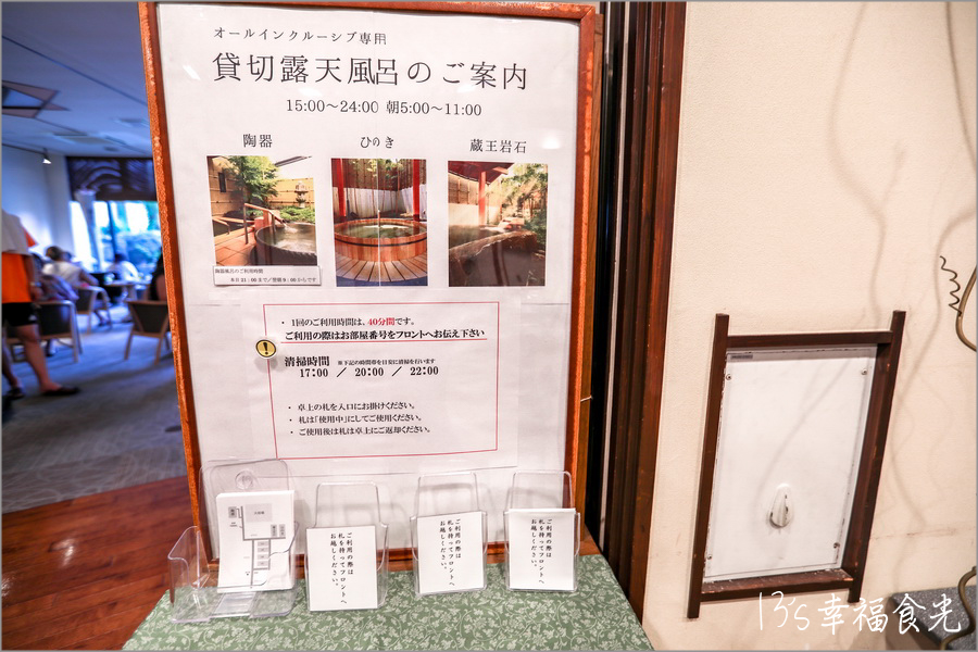 在這裡泡溫泉除了大浴場可泡外,另外還有三間私人主題湯屋提供租借使用,每次40分鐘,費用2200日圓,需提前預約。