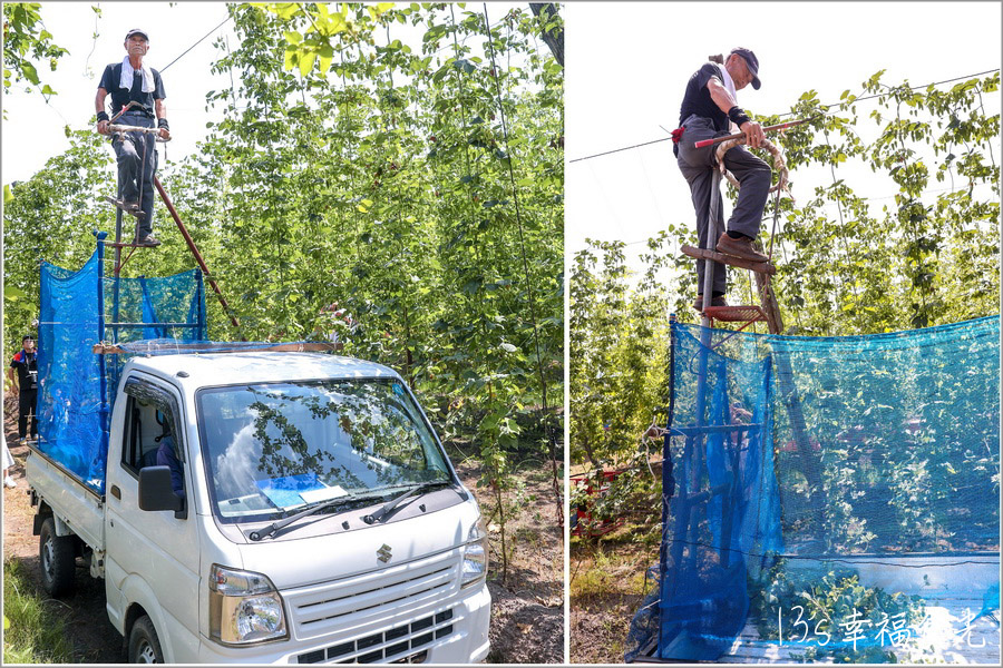 採摘的方式好特別,需一人爬上特殊改造過的小貨車上面,站上去的高度有二層樓高,再慢慢依序從頂端位置割下一叢叢啤酒花。
