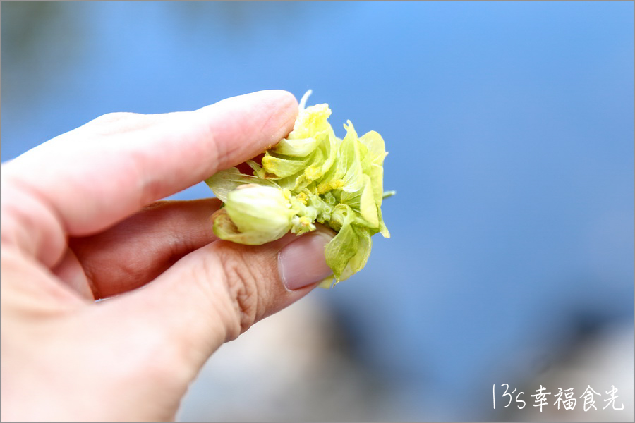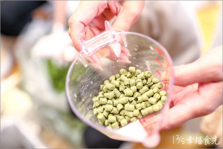 ▼槌谷先生還教我們可以用手輕輕揉開啤酒花毬果,接著加到啤酒裡,再嚐嚐不一樣的風味,果然把啤酒花加進去後,多了點苦味,但整體香氣也提升了。