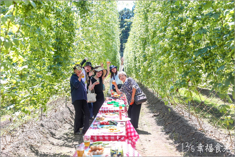 採摘啤酒花體驗告一段落後,再度回到花田中,此刻即享受勞動後的美味午餐時光,這樣的儀式感氛圍讓我想起了彰化埔心葡萄隧道下的餐桌饗宴,類似品酒會活動。