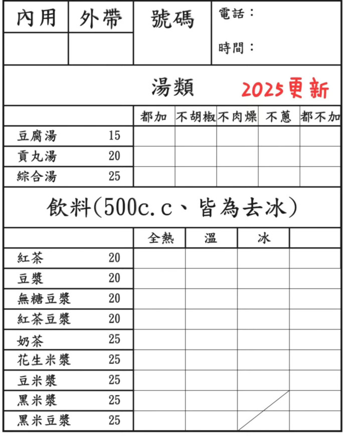 早餐品項除了招牌「鹹油條」,另外也有炒麵、蔥油餅、豬肉餡餅、紅豆餡餅、湯品和飲品等品項。在鹹油條的選料上,雖然沒有另一家多,但還是能依喜好的口味選擇搭配香菇、蛋、蔥蛋、熱狗、茭白筍和排肉。