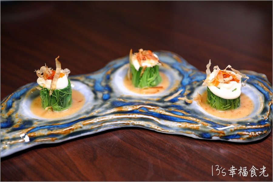 開胃涼菜一上桌,就被精緻的擺盤給吸引了,再嚐一嚐這道魚卵塔野蔬,它是涼拌的過貓菜佐上胡麻醬、白醋、魚卵和少許柴魚片,味道相當清爽又開胃,有讓我驚豔到。