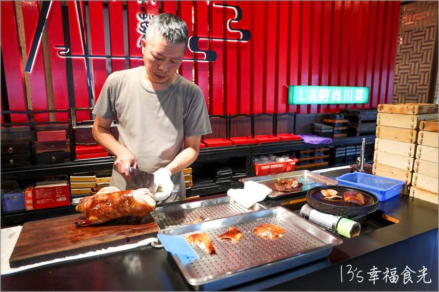 ▼LA時尚川菜選用的是有合格鴨肉認證標章的格全櫻桃鴨(宜蘭櫻桃鴨),還能看見主廚在料理台上那俐落的片鴨刀工,一刀一刀片下帶粉色的鴨肉,隨後美味滿點的片皮鴨就出現在餐桌上啦!
