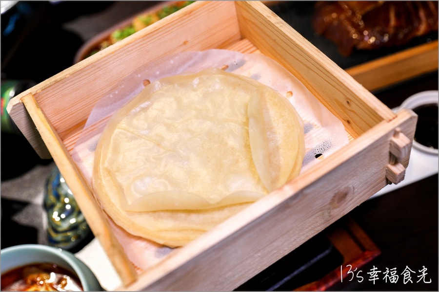 ▼用蒸籠裡溫熱的餅皮,包入剛片下來的片皮鴨肉、蔥段、小黃瓜,再抹上甜麵醬後,包起來就能直接大口品嚐片皮鴨的好滋味了。吃在嘴裡一點也不油膩,還可以吃到鴨肉香嫩腴滑的油脂。