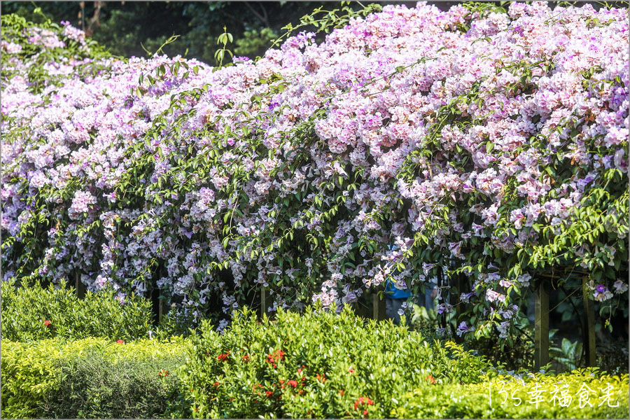 ▼平日賞花人潮已經不少,將近有200公尺蒜香藤花況非常好,長長的粉色花瀑布真的好吸睛。